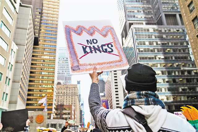 3月28日,在美国纽约,抗议者手举“不要国王”标语牌。新华社记者 张凤国 摄 |