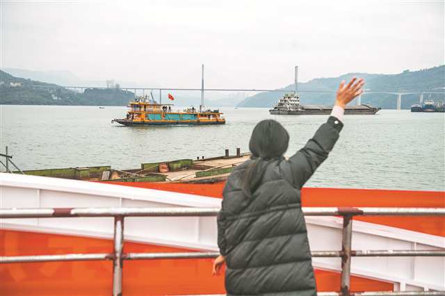 2025年12月22日,忠县一家造船厂,曹利芳前来探访正在内部安装的新船,正好老船途经江面,她兴奋地向当值的船员们挥手。 |