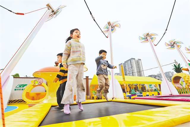 当前,重庆及周边省市中小学生迎来春假,学生们纷纷走进大自然,或休闲娱乐,或研学旅行,乐享春假时光。图为四月二日,沙坪坝区重庆融创文旅城,小朋友们在跳蹦蹦床。特约摄影 孙凯芳\视觉重庆 |