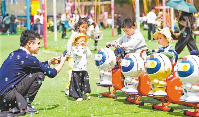 4月4日,垫江县牡丹樱花世界景区,小朋友在玩泡泡机。特约摄影 龚长浩/视觉重庆