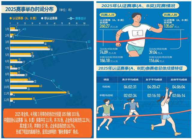《蓝皮书》显示,2025年全国共举办马拉松相关赛事594场,赛事总规模639.87万人次。获中国田协A、B类认证的赛事有341场,其中全程马拉松项目完赛有39.04万人、74.09万人次,半程马拉松项目完赛有116.64万人、186.18万人次,均较2024年有明显增加。