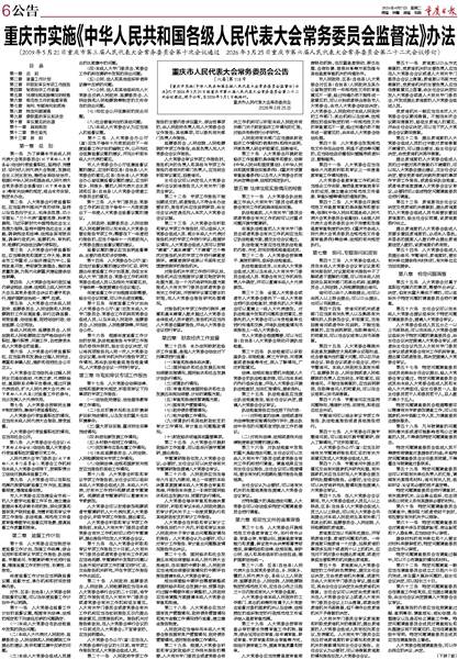 《重庆市实施〈中华人民共和国各级人民代表大会常务委员会监督法〉办法》已于2026年3月25日经重庆市第六届人民代表大会常务委员会第二十二次会议通过,现予公布,自2026年5月1日起施行。