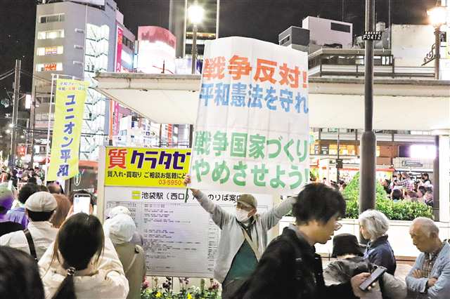 四月五日晚,人们在日本东京池袋站前的集会现场手持标语抗议,反对高市政府为武器出口“松绑”。新华社记者 李子越 摄 |