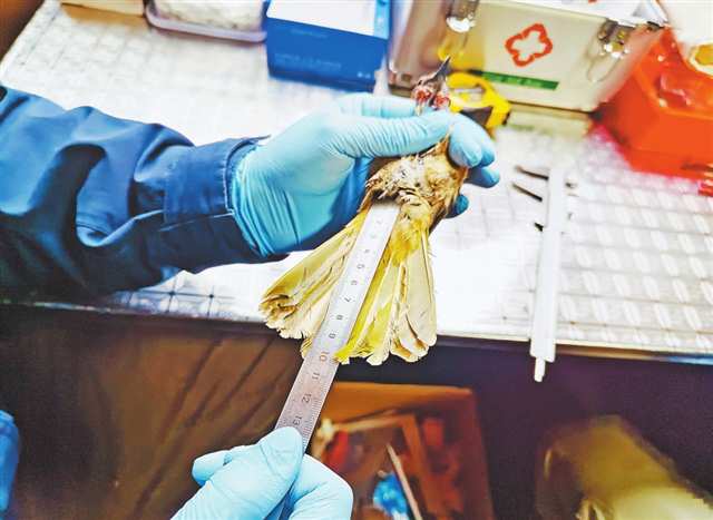 取下的鸟儿会被放入环志袋里,然后带回办公室。在四面山鸟类环志站内,工作人员轻柔地为每一只鸟儿测量体型,记录数据,然后将一枚指甲盖大小的金属环固定在它们脚上,再迅速将其放飞。“在环志前,我们会全方位测量鸟儿的健康状况,只有状态良好的鸟儿才能进行环志。”张超说。