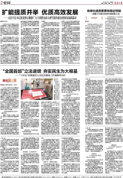 立法审议项目数量翻番,“全国首部”的创制性立法递增;执法检查创新迭代,“一法一条例”模式成为品牌;民生实事人大代表票决制全面铺开,代表深度参与民生监督……这些具有重庆辨识度的法治建设工作,有力夯实了人民至上、民生为大的根基。