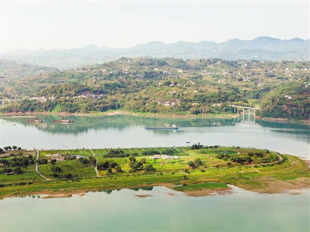 4月8日,涪陵区南沱镇睦和村,船只从江上驶过,沿岸绿意盎然(无人机照片)。