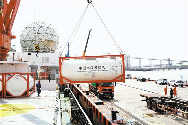 4月9日,工作人员操作机械从“雪龙”号上卸货。
