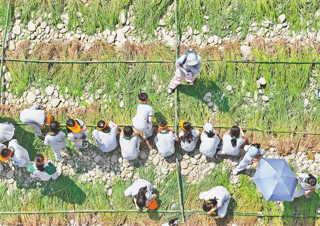 4月9日,江津区龙华镇鼎锅浩产卵场,孩子们正在体验搭建人工鱼巢(无人机照片)。