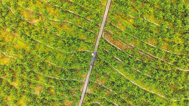 这里过去人迹罕至,如今却是一派忙碌景象:林间薄地开垦出一垄垄整齐的田土,上面铺设着一小段一小段的木块,十多名村民正在“种植”菌包。