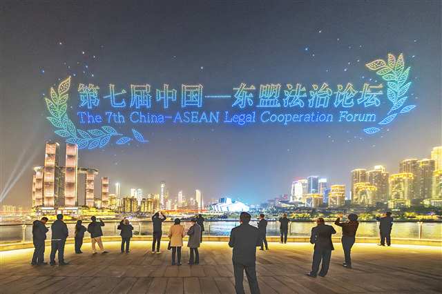 重庆市规划展览馆,第七届中国—东盟法治论坛中英文字样在夜空中交相辉映。记者 李雨恒 摄/视觉重庆 |