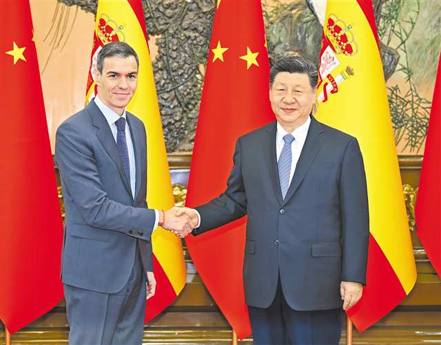 桑切斯表示,我4年来4次访华,表明双方对西中关系的高度重视。中国企业在西投资合作有力促进了西经济发展。西班牙坚定恪守一个中国原则,高度重视中国的大国地位,坚定致力于发展具有战略定力的西中伙伴关系,希望加强贸易、投资、新能源等领域合作,促进人文交流。面对复杂严峻的国际形势和频发多发的冲突争端,只有坚持多边主义、推动构建多极世界才能为人类带来持久和平。西班牙积极支持习近平主席提出的四大全球倡议,愿同中方密切沟通协作,共同应对国际地缘政治、贸易保护主义、气候变化等方面挑战,维护国际法和多边主义。西班牙反对“新冷战”,反对“脱钩断链”,支持欧洲和中国增进沟通理解、加强合作。欧中关系健康发展符合双方共同利益,也有利于世界和平稳定。