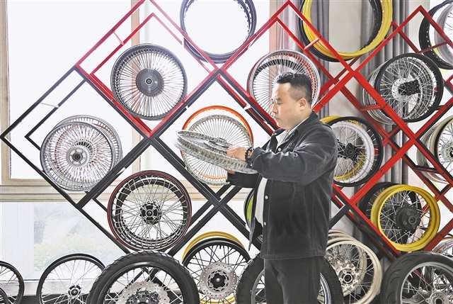 4月13日,沙坪坝区青木关镇重庆腾承机械制造有限公司生产车间,技术人员正在对一款摩托车辐条轮毂进行设计优化。该公司主要研发摩托车轮毂和轮辋等配件产品。特约摄影 孙凯芳/视觉重庆 |