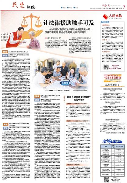 去年1月1日,新修订的《重庆市法律援助条例》(以下简称新《条例》)正式实施。新《条例》提出,进一步扩大法律援助覆盖面,以更智能化、便捷化的服务,让法律援助触手可及。