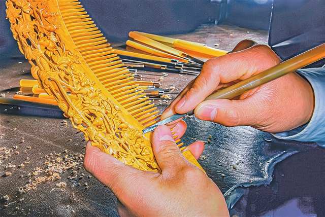 在第二届“一带一路”国际技能大赛上,俞达洪现场展示浮雕、镂空雕等技艺,让这项重庆市非物质文化遗产以更生动、直观的方式呈现在人们面前。他还走进校园,向师生展示木梳制作中的浮雕、掐丝珐琅等技艺。