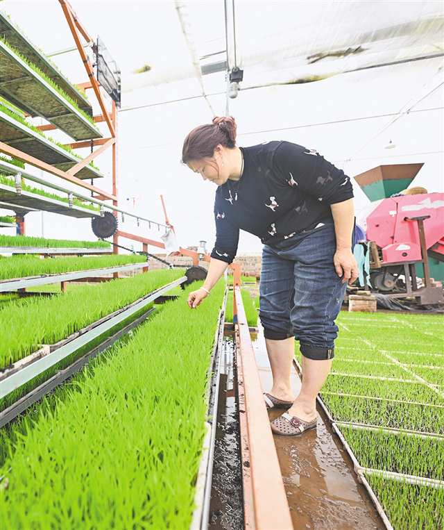 4月9日,铜梁区土桥镇大磨村,村民在育秧棚内查看秧苗长势。