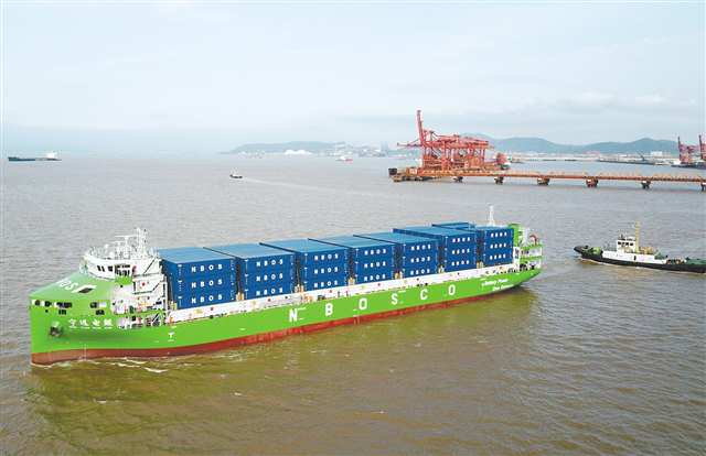 4月15日,全球最大、国内首艘万吨级纯电动智能集装箱海船“宁远电鲲”轮从宁波舟山港北仑港区启航,驶向嘉兴港乍浦港区,标志着该船正式投入商业航线运营。新华社发