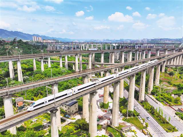 4月16日,成渝高铁列车驶过重庆中心城区(无人机照片)。