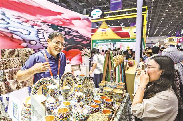 4月15日,观众在第六届消博会现场了解伊朗工艺品。第六届中国国际消费品博览会吸引了来自60多个国家和地区的超过3400个品牌参展,汽车、电器、食品、酒类等众多全球好物齐聚消博会,海南自贸港尽显“国际范”。新华社记者 张丽芸 摄 |