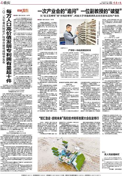 我市还组织在渝高校全覆盖盘点“沉睡专利”,高校院所发明专利转让许可3060件,产业化率达10.62%。