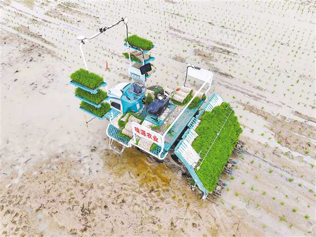 4月15日,梁平区仁贤街道仁贤社区,无人驾驶插秧机在进行水稻插秧(无人机照片)。