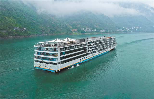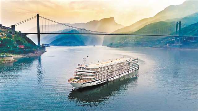 据介绍,这两艘游轮是豪华游轮的标杆之作。“重轮·长江云帆”是重庆轮船(集团)有限公司旗下五星级豪华三峡游轮,首创游轮景观灯系统,打造了三峡首个超大公共艺术作品与流动艺术馆,让游船成为行走的文化载体。其船长150米、宽23.38米,载客650人,共设302间客房。它涵盖总统套房、豪华套房、亲子套房、行政标准间等多种房型。配套了特色餐厅、酒吧演艺厅、KTV包房、露天观景台、中医理疗馆、儿童游乐场、健身运动房等设施,集“住、食、游、购、娱、养”于一体。