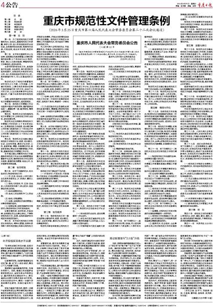 《重庆市规范性文件管理条例》已于2026年3月25日经重庆市第六届人民代表大会常务委员会第二十二次会议通过,现予公布,自2026年6月1日起施行。
