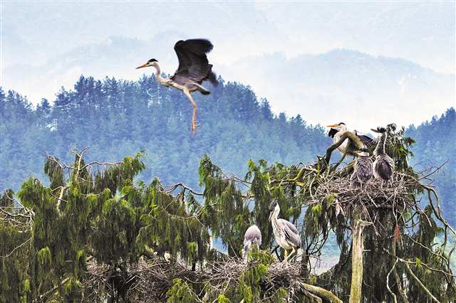 望岭村生态环境优良,村里的一株树龄逾百年的柏木树,每年春天,都会有数百只苍鹭“如约而至”,在树上筑巢产子,栖息生活,入冬后才南飞。这一奇观已经持续了一百多年,从未间断。如今,这株柏木树已被黔江区林业部门列入名木古树名录。