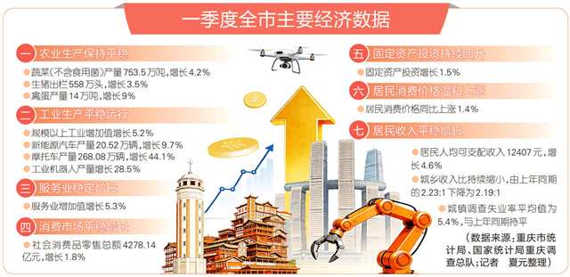 本报讯 (新重庆-重庆日报记者 夏元)4月20日,市统计局、国家统计局重庆调查总队联合公布2026年度一季度我市经济发展数据,一季度全市实现地区生产总值7923.49亿元,同比增长4.5%。其中,第一产业实现增加值316.84亿元,同比增长3.8%;第二产业实现增加值2524.83亿元,同比增长3%;第三产业实现增加值5081.82亿元,同比增长5.3%。