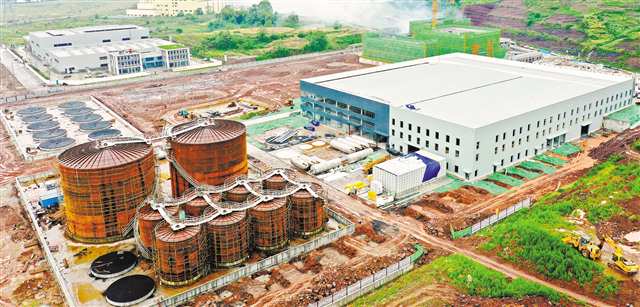4月20日,万盛经开区万盛工业园区(关坝组团)循环经济产业园,年产50万吨生物质燃油研发制造一期项目正式投产(无人机照片)。