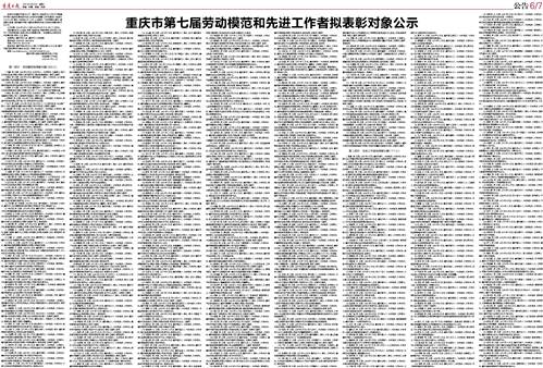 重庆市第七届劳动模范和先进工作者拟表彰对象公示