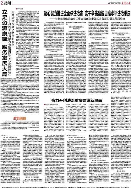 回望五年历程,法治重庆建设步伐铿锵有力——在全国率先出台智能网联汽车、民用无人驾驶航空器等规章,推动新兴产业发展驶入“快车道”;重庆法院首创的铁路提单裁判规则,成功写入联合国国际贸易法委员会《可转让货物单证公约》;“智慧检务”集成“非羁押人员管控”等9个多跨场景,初步解决传统检察监督被动、线索发现难等问题;建设“警快办”公安政务服务平台,上线服务事项434项;在“百城法治政府建设评估”中跻身全国十强……法促善治更规范,法护发展更强劲,法创平安更坚实,法铸公正更有力,法惠民生更有效,法助开放更有序,法治成为现代化新重庆建设中最鲜明的底色和最坚实的支撑。