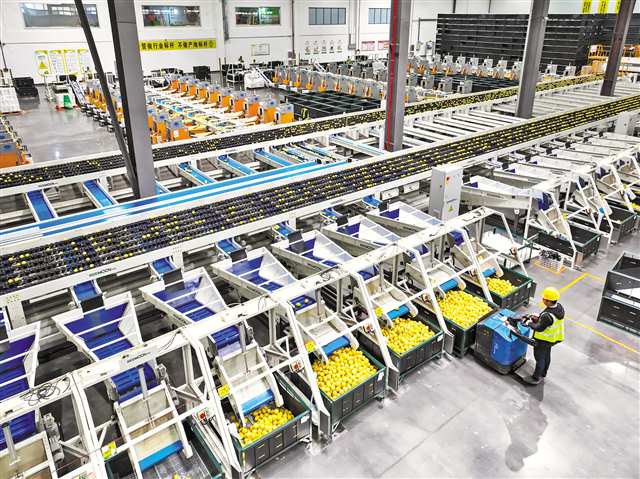 潼南区雪王农业有限公司车间内,工人在转运已分拣包装的柠檬鲜果。记者 张春晓 摄/视觉重庆 |