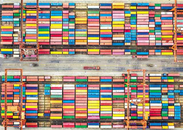 集装箱整齐堆放在重庆果园港码头,等待出港(无人机照片)。首席记者 龙帆 摄/视觉重庆 |