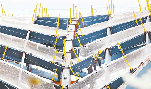 成渝中线高铁铜梁站施工现场,工人正加紧站房钢结构吊装施工。特约摄影 钟志兵/视觉重庆 |