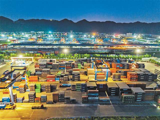 4月25日晚,位于沙坪坝区的西部陆海新通道重庆无水港灯火通明,一派繁忙景象(无人机照片)。