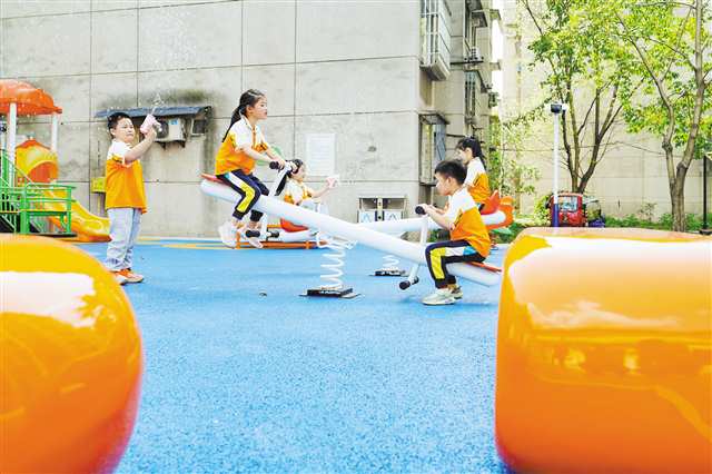 4月24日,北碚区龙凤桥街道,孩子们在新改造完工的社区体育公园玩耍。