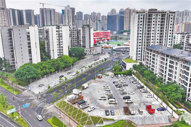 4月27日,九龙坡区石桥铺街道高庙路,新投用的便民停车场干净整洁(无人机照片)。