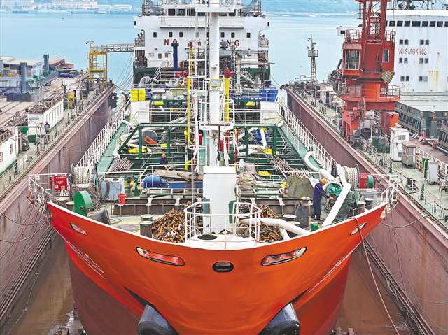 图为4月27日,在江苏省连云港鸿云实业有限公司生产基地,一艘船舶正在建设中(无人机照片)。