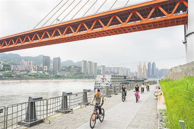 近年来,重庆全力推进两江四岸治理提升,两江四岸滨江道路已贯通103公里,建成慢跑道、骑行道等分层步道超150公里,把大江、城廓、青山完美融在了一起。