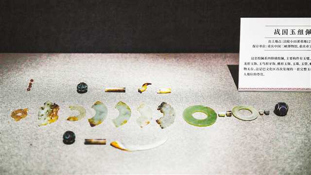 值得一提的是,本次展览展出了重庆中国三峡博物馆、重庆市文化遗产研究院保存、出土于涪陵小田溪的战国玉组佩。