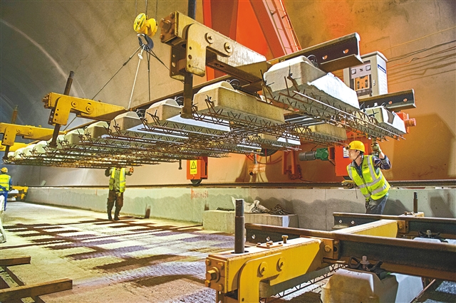 近日,郑万高铁万州天城隧道施工现场,工人正在铺设无砟轨道。