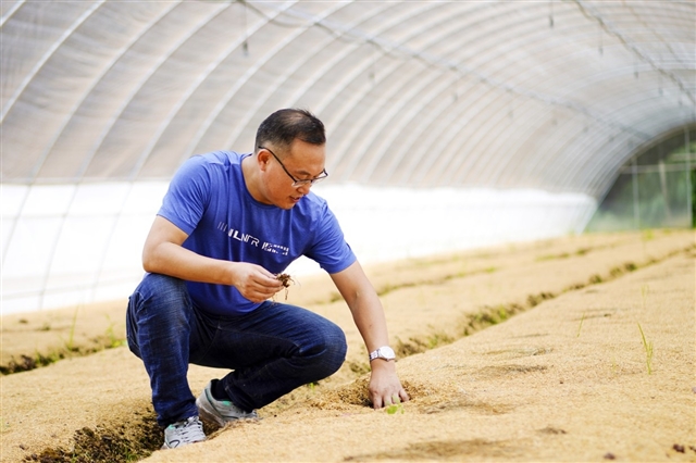 45岁罗风华是石柱县中益乡华溪村驻村第一副书记,他正在村里的黄精育苗大棚内查看黄精苗的长势。近年来,在扶贫干部的带动下,中益乡发生了翻天覆地的变化:路通了、产业发展好了、人居环境也提升了,村民们从细枝末节的生活习惯到努力奋斗的精气神都有了很大改变。