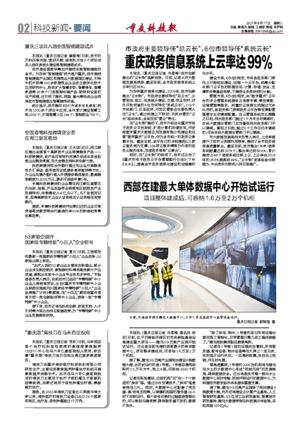 重庆三项目入选全国智能建造试点重庆政务信息系统上云率达99%全国首笔科技跨境贷业务在两江新区落地西部在建最大单体数据中心开始试运行53家渝企获评国家级专精特新“小巨人”企业称号“重庆造”海扶刀在马来西亚投用