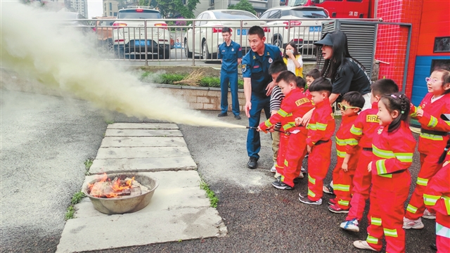 消防员为小朋友科普消防器材使用方法。 (本版图片由九龙坡区科协提供) |