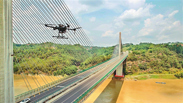 近日,重庆市交通工程质量检测有限公司的工程师和技术专家团队,聚集在四川省宜宾市岷江特大桥桥梁下,启动一架名为“凌志2”的无人机,为大桥开展定期巡检。
